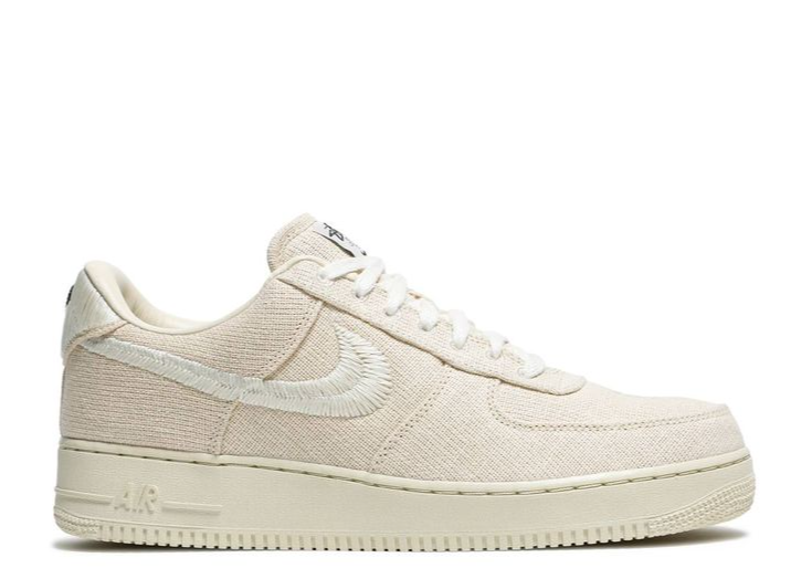 Nike Air Force 1 Low x Stussy "Fossil" är en specialutgåva skapad i samarbete med streetwear-märket Stussy. Skon har en överdel tillverkad av naturlig hampa som ger en unik textur och känsla. Den kännetecknas av en delad broderad Swoosh, ett "Stussy World Tour"-logotyp på plösen och ett dubbelt "S" broderat på tåboxen. Hälfliken har också en metallisk emblem med samma logotyp. Skons neutrala färgpalett består av Fossil Stone, Sail och Off-White, vilket kompletteras av en off-white yttersula som bidrar till dess stilrena design.